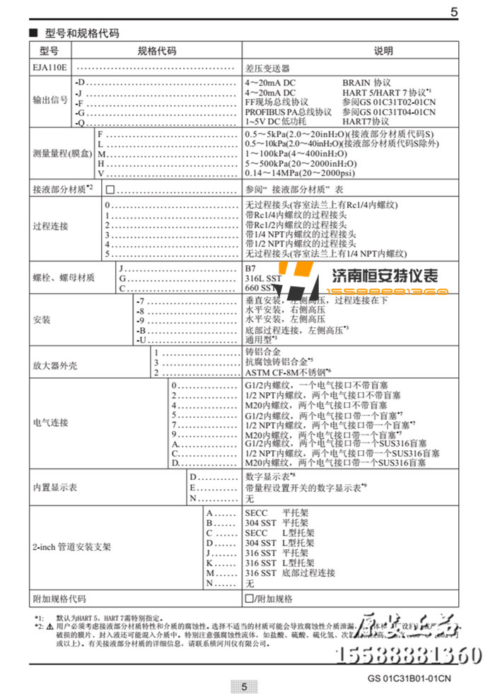 横河EJA110E选型表: